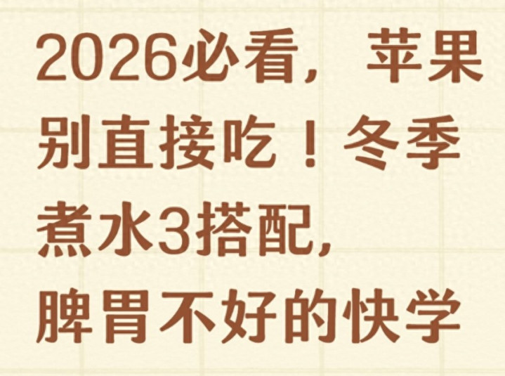 其实,解决这些冬季常见的小毛病,不用花钱买昂贵的保健品,也不用动不动就吃药,咱们身边最常见的苹果就能派上大用场。可能有人会说:“苹果谁不会吃?洗干净直接啃就行了!” 但2026年冬季养生的新趋势告诉我们:苹果别直接吃,冬季煮水喝才是王道,尤其是搭配对了食材,比人参还养人,能轻松调理脾胃、补气血、助睡眠,脾胃不好的朋友赶紧学起来!